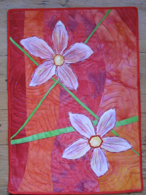 I had hoped to use my own hand dyed fabris, but sadly the reds were rather wishy washy pinks, so these fabrics came from a pack of fat quarters I had in my stash which proves that I am willing to declutter!